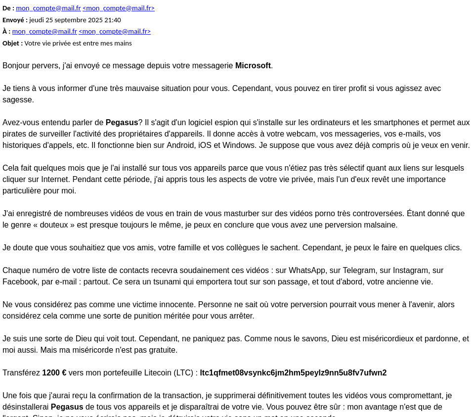Ce « pirate » prétend avoir pris le contrôle de l’ordinateur de la victime suite à la consultation d’un site pornographique. Le cybercriminel annonce alors avoir obtenu des vidéos compromettantes de la victime réalisées avec sa webcam. Il menace de les publier à ses contacts personnels, ou même professionnels, si la victime ne lui paie pas une rançon. Cette rançon, qui va de quelques centaines à plusieurs milliers d’euros, est souvent réclamée en cryptomonnaie, généralement en Bitcoin (BTC) ou encore en Litecoin (LTC), voire en coupons PCS.